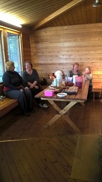 Saunan jälkeen kahvia, teetä ja makeaa/suolaista herkuttelua.
